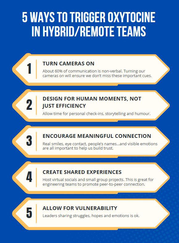With awareness and intentional action and regular reflection, both dopamine and oxytocin levels can be nurtured, even in remote or hybrid environments. It’s all about small changes, built into daily workflows.